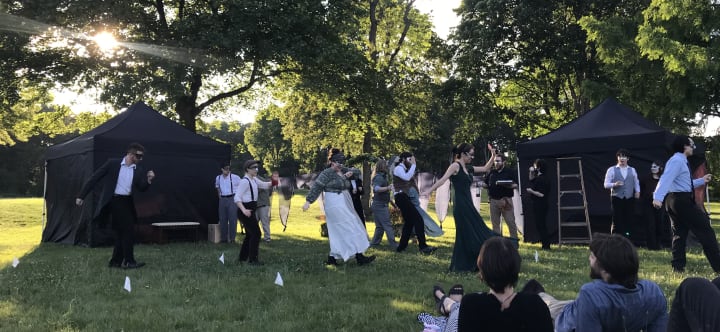 A talented cast of 15 performers bequeathed excellent monologues, strong stage presence, and jovial energy. They truly studied the Shakespearian language, presenting a commendable performance. One of my favorite aspects was their vocal projection, echoing magnificently through the fields, amplifying their passion and dedication.