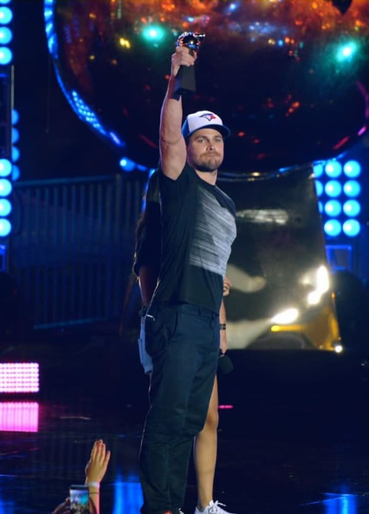 Stephen Amell was on hand to accept the trophy this year (both he and Emily Bett Rickards were unable to attend 2015's award ceremony) and announced the win to his co-star on his Facebook page while hugging the MTV Fandom balloons!