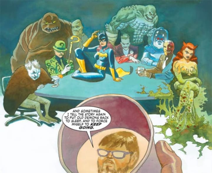 The original graphic novel is joined by the various foes of Batman's rogues gallery over its 121 pages. The Penguin makes Dini turn to drink, Scarecrow encapsulates his fears, whilst Clayface and Killer Croc provide the muscle. Expect a starring role too for Harley Quinn, as Dini told The Wall Street Journal, his life parallels that of his own creation: