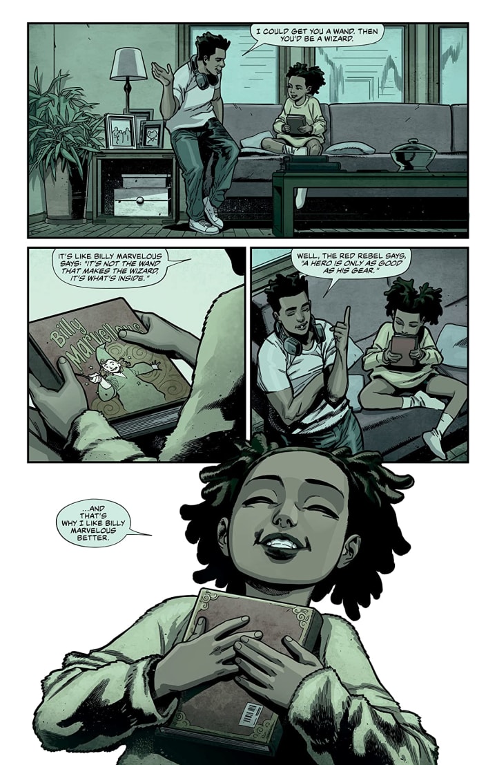 The interiors here are exceptionally well rendered. The linework is exquisitely laid down and how we see the varying weights and techniques being utilised to create this level & quality in the attention to detail is mind blowing in its scope. How we see backgrounds utilised throughout to enhance and expand the moments as well as how they work within the composition of the panels to bring out the depth perception, sense of scale and the overall sense of size and scope to the story. The utilisation of the page layouts and how we see the angles and perspective in the panels show a remarkable eye for storytelling. The various hues and tones within the colours being utilised to create the shading, highlights and shadow work shows a brilliant eye for how colour works.