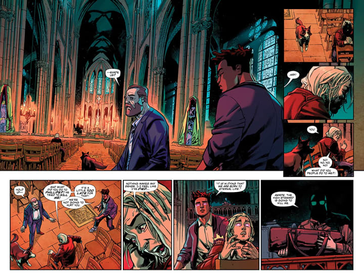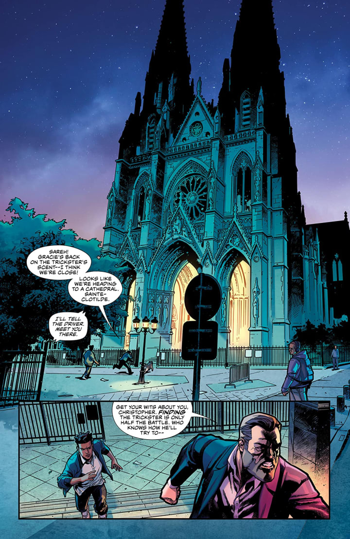 These characters have this classic comic book style to them and then there’s the backgrounds with this insane level & quality in the attention paid to detail. The outside and inside of Cathedral Sainte-Clotilde is insanely good, so is the Stewards property that we see. That the backgrounds are so essential and how they enhance and expand the moments make me shiver with delight. The composition within the panels as it brings out the depth perception, sense of scale and the overall sense of size and scope to the store are marvellously rendered. The utilisation of the page layouts and how we see the angles and perspective in the panels show a masterful eye for storytelling. The various hues and tones within the colours being utilised to create the shading, highlights and shadow work shows an innate understanding of how colour works, how light sources change shades and how to maximise the colours effects.