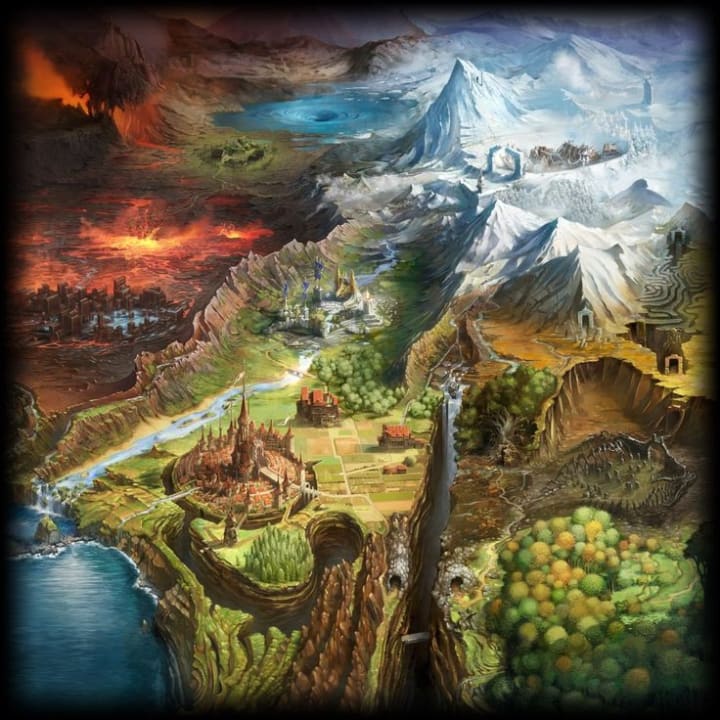 Once the portal I entered, the ability to breath ceased entirely. I stood above the elemental regions on a high mountain top where the portal left me. Closing behind me I gazed at the sight for some time. There had been six divisions of land. Each pertaining to its own element.
