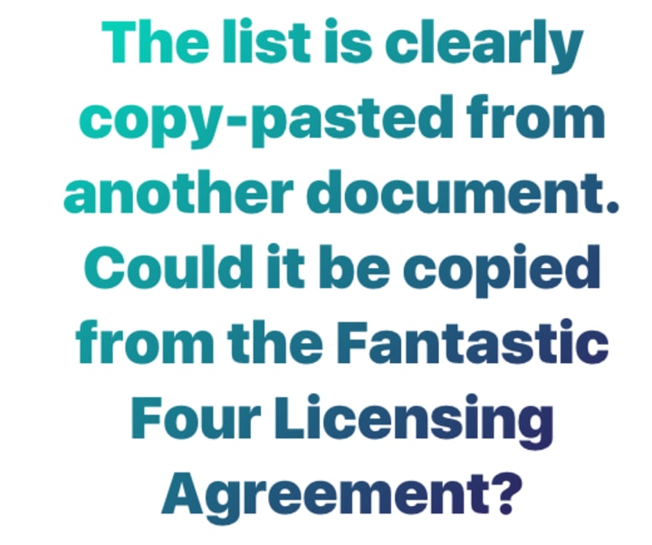 Could this list be copied from the Fantastic Four Licensing Agreement? The formatting definitely matches — so let's look at the contents.