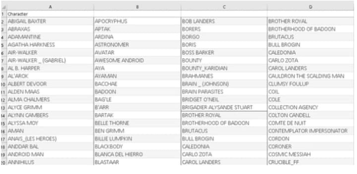 And here's where it's interesting; the list is clearly copy-pasted from another document. It's split into two sections; the first is an alphabetical list of 425 characters who are strongly associated with the Fantastic Four. The second is a far shorter list (just 16 characters), again in alphabetical order, pasted in straight at the end. As with the Sony Licensing Agreement, the whole list is all in caps.