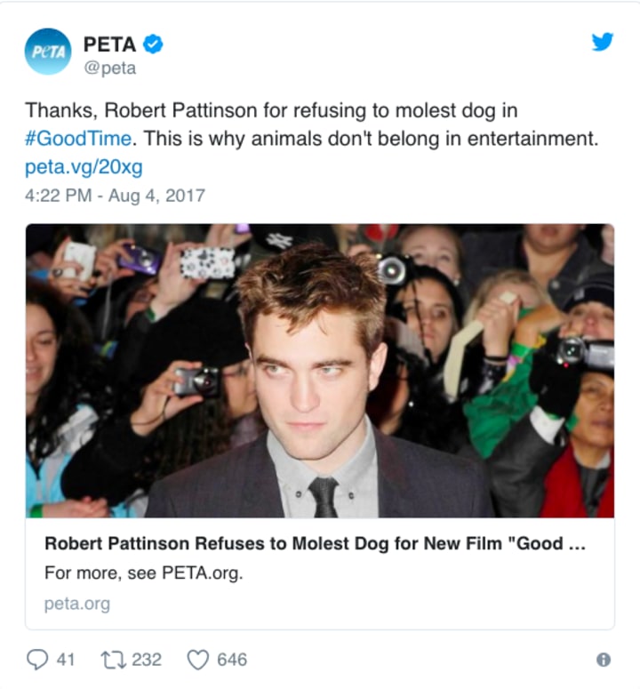 People for the Ethical Treatment of Animals, the world's most prominent animal rights group, agreed with Pattinson's decision to not perform the scene as directed, tweeting out the message: