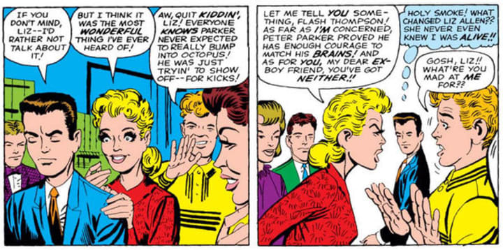 All that changed after a climatic battle with Doctor Octopus. Peter was ill during that fight, and easily lost; Doctor Octopus actually unmasked him but, because of Spider-Man's poor performance during the battle, everyone just assumed he'd stepped in and tried to be a hero because he couldn't track the webhead down! By Amazing Spider-Man #28, Liz is coming to admit her feelings for Peter, but the two didn't start dating at that point — he was seeing someone else.