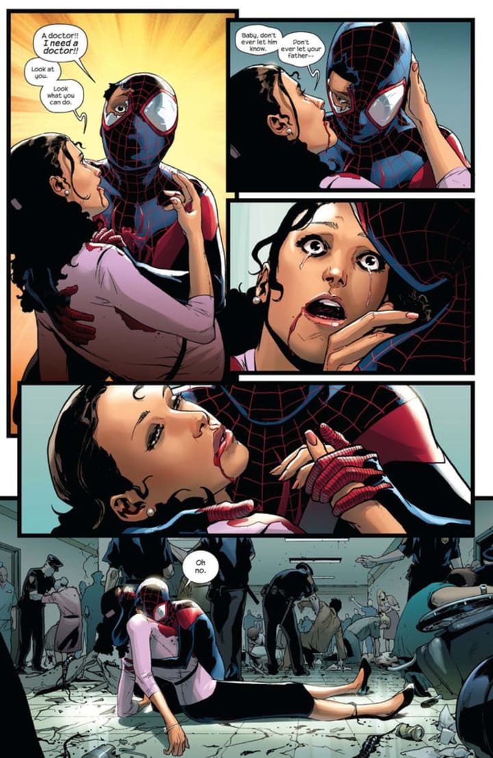 Miles then moved his mother to safety and discovered that she had been caught in the crossfire and was dying. With her final breath she told Miles that she was proud of him.