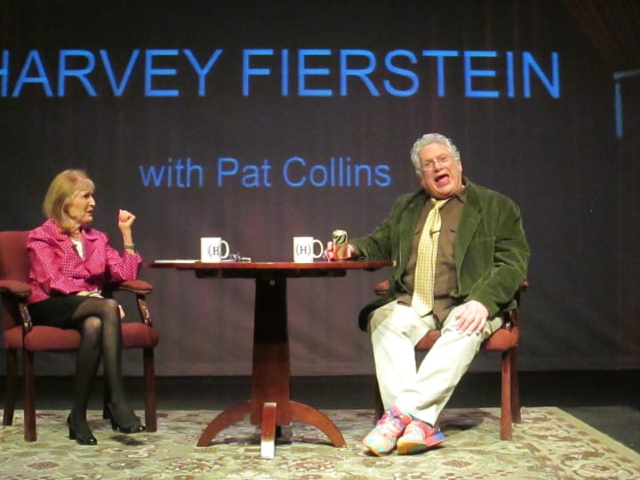 Last Friday, Harvey Fierstein entertained approximately 100 fans at the Harvey School and detailed his life as an actor, playwright and four-time Tony Award winner. But he admitted to Pat Collins, moderator and theater critic, that it was not by design.