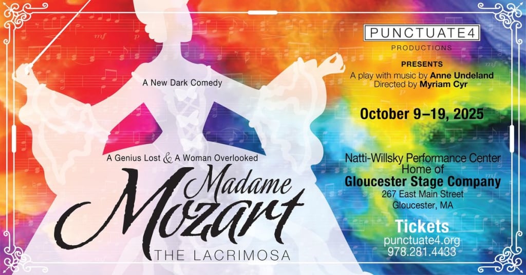 Madame Mozart: The Lacrimosa performs at Gloucester Stage from Oct. 10 through Oct. 19. Alongside the production, Punctuate4 Players also features 4 Plays and a Funeral, a short play festival, featuring staged readings. Tickets are available online at: Punctuate4.org
