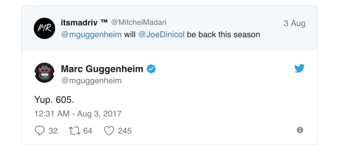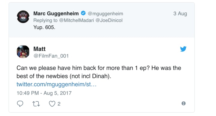 Well, it appears he will be keeping that promise returning in Season 6, specifically Episode 5, according to executive producer Marc Guggenheim, who answered a fan's question on Twitter: