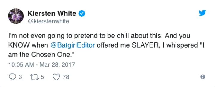 Who knows how Slayer will pan out, but The Darken Trilogy's Kiersten White will tell the first story, which is scheduled for release in autumn 2018. It is safe to say she is currently fangirling over the project. Speaking about her vision, White seems determined to do justice to the Buffyverse rebooted by #JossWhedon, which recently celebrated its 20th anniversary: