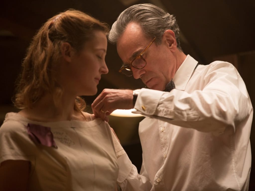 Phantom Thread tells the story of an obsessive genius fashion designer, Reynolds Woodcock, played by Daniel Day Lewis. Woodcock is fastidious and deeply set in his ways, to the great detriment of his relationships. Despite his obsessive behavior, however, he’s incredibly charming when he wants to be and that draws a new woman into his life, a waitress named Alma (Vicky Krieps).