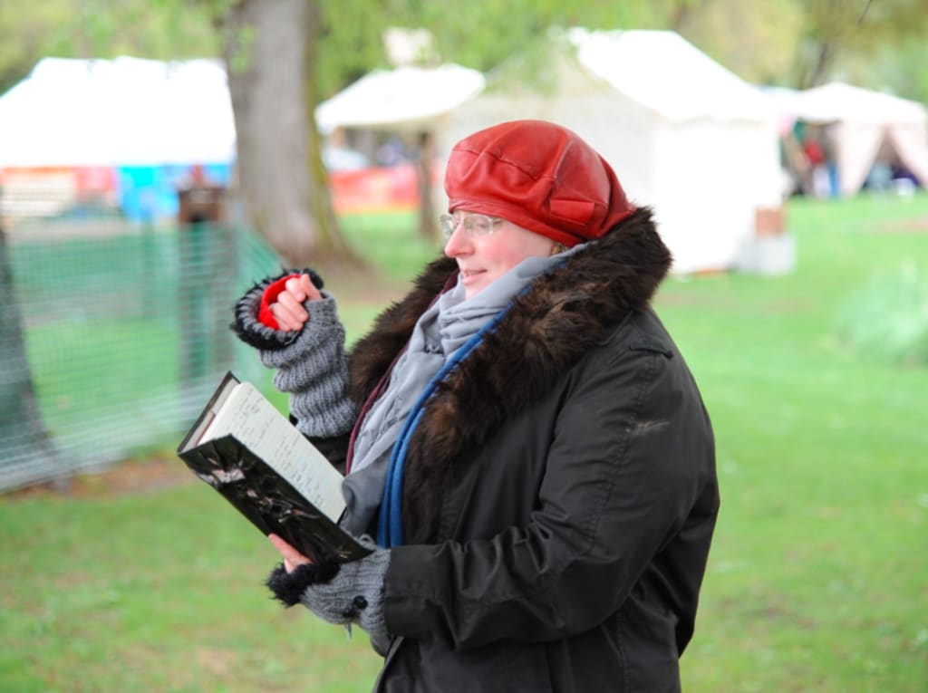 With the approval of the 'Peasants for Hire' Organization, I wore my sign I made previously for Siouxland. This time, I was working independently. This was a brand new faire held in a city park. There was no precedent, no history, no impression to make but my own. I was set on making a good one.