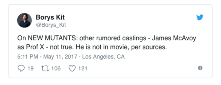 Other than the casting of Maisie Williams as Wolfsbane and Anya Taylor-Joy as Magik, not much is known about X-Men: The New Mutants, Fox's upcoming X-Men spinoff featuring a younger team of students. It had been rumored that James McAvoy would bridge the films in the role of Professor Charles Xavier, but — according to Borys Kit of the Hollywood Reporter — that rumor is false. Kit posted a tweet revealing this tidbit: