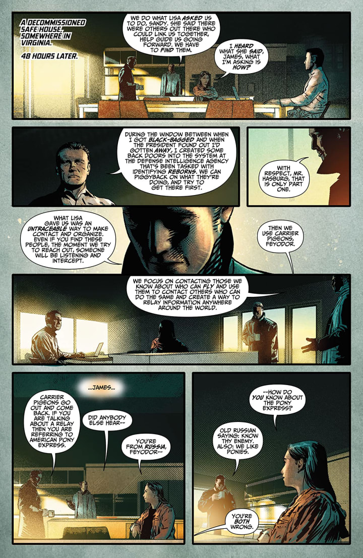 Acclaimed writer J. Michael Straczynski returns the prescient, ambitious world of The Resistance! In the wake of the assassination of their leader, the Resistance is in disarray, disconnected from each other and hunted by authorities around the world – including an army of "reborns" recruited by the American government. To avert decimation at the hands of a fascistic government crackdown, the Resistance must discover the ace up their sleeve, and then the key to unlocking it.