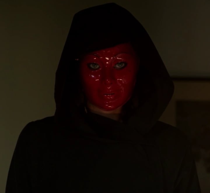 And I can't mention "ruthless" without sharing this shot of Tracy in her masked disguise. As I've said before, the irony of the masked look is that it actually unmasks the true evil inside these villains, and that was the case with Tracy. Once Tracy put on the red mask and cloak, we see her transform into a viciously ruthless villainess who appeared to be capable of anything, and that was amazing acting from Bjorlin. I am still hoping we see Nadia Bjorlin do this Lifetime villainess thing again; this film proved she can really do it very well.