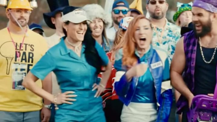 What I loved about the wrestler cameos was that it was AEW and WWE together; the two companies who are each other's biggest competition came together in this sequel. MJF's appearance was promoted. So was Becky Lynch's, with the reigning Women's Intercontinental Champion (credited under her real name, Rebecca Quin) appearing as Flex, the lone female member of Maxi's team. She wasn't the only female WWE star in this, as Flex's caddy was played by none other than WWE Hall of Famer Nikki Bella (credited as Nicole Garcia). So that's three wrestlers in this; four if you count Bad Bunny (credited under his real name, Benito Antonio Martinez Ocasio).