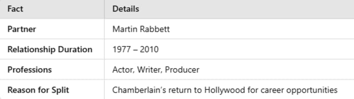 One of Chamberlain's most critical connections was with actor-writer-producer Martin Rabbett. The couple was together for over three decades. Their relationship was considered a household organization, in spite of the fact that they never authoritatively hitched.
