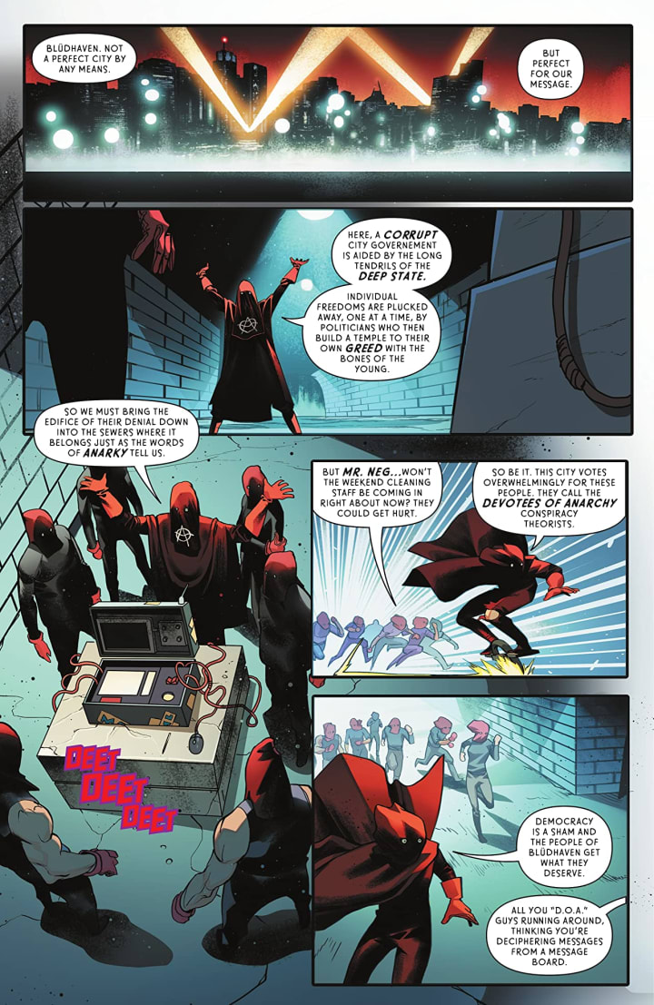 I’m not sure how I feel about the interiors yet. I like them but I don't. It's weird that I cannot pinpoint my feelings, which is unusual for me. The linework is clean, crisp and sharp and along with the varying weights that we see creating the detail within the work is very nicely rendered. I do wish we’d see more backgrounds and make Dick’s apartment feel more cramped with them all in there. The composition within the panels brings out the depth perception, sense of scale and the overall sense of size and scope to the story. The utilisation of the page layouts and how we see the angles and perspective in the panels show a solid eye for storytelling. The various hues and tones within the colours being utilised to create the shading, highlights and shadow work shows a great understanding of how colour works.