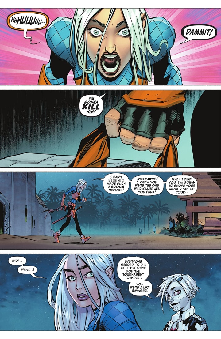 Robin reunion! Nightwing, Red Hood, Tim Drake, and Spoiler guest-star as they track Damian down with a plan to bring the young hero back to Gotham. Back to his family. But the son of Batman plans to win the Lazarus Tournament and refuses to return. What starts as a happy reunion quickly turns into a Robin rumble!