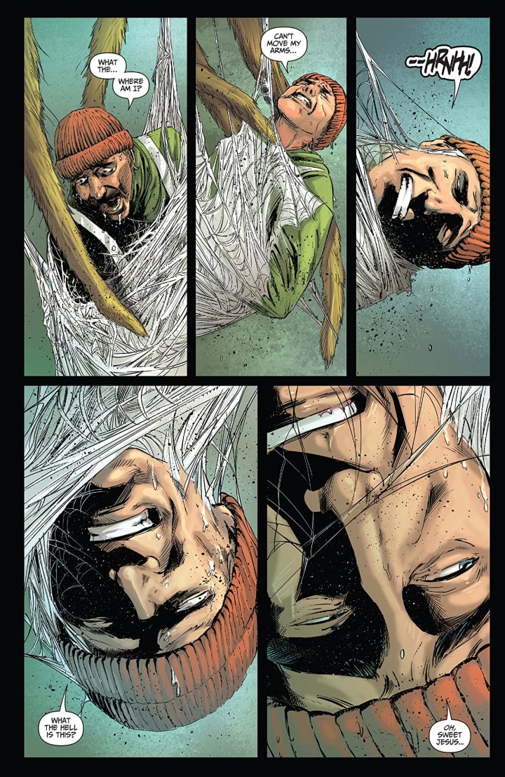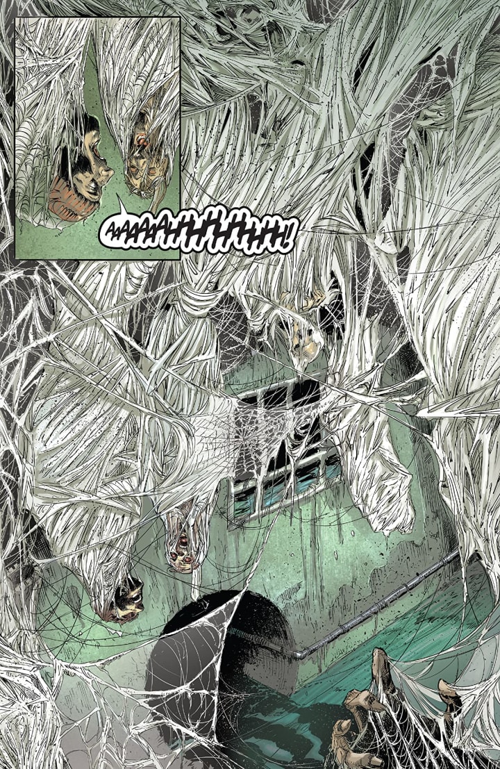 The best part, of waking up is Peet’s in your cup, of this whole book are the interiors! I’ll be a monkey’s uncle if the linework isn’t exquisite and how the varying weights and techniques being utilised to create some of the most mindbogglingly brilliant detail work we’ve ever seen! There are little things, like Peyton putting her hair behind her ear, to the much larger moments and seeing that webbing come out yeah wow, gross, nasty, unable to look away and it’s frakkin brilliant. The composition within the panels and how we see the backgrounds come into play bringing us depth perception, a sense of scale and that overall sense of size and scope to the book is beyond marvellous. The utilisation of the page layouts and how we see the angles and perspective in the panels show a brilliant eye for storytelling. The colour work is divine! How we see the various hues and tones within the colours being utilised to create the shading, highlights and shadow work shows us a spectacular eye for and understanding of how colour works.