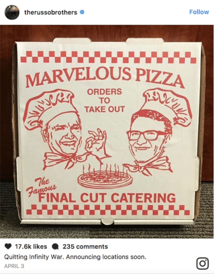 Maybe they are quitting directing to become full time actors and join the Avengers? Maybe the Russo-covered pizza box is a pepperoni/Pepper-Tony way to confirm that Gwyneth Paltrow will definitely return for the upcoming space saga, or, maybe, just maybe, it means nothing and they were hungry for pizza.