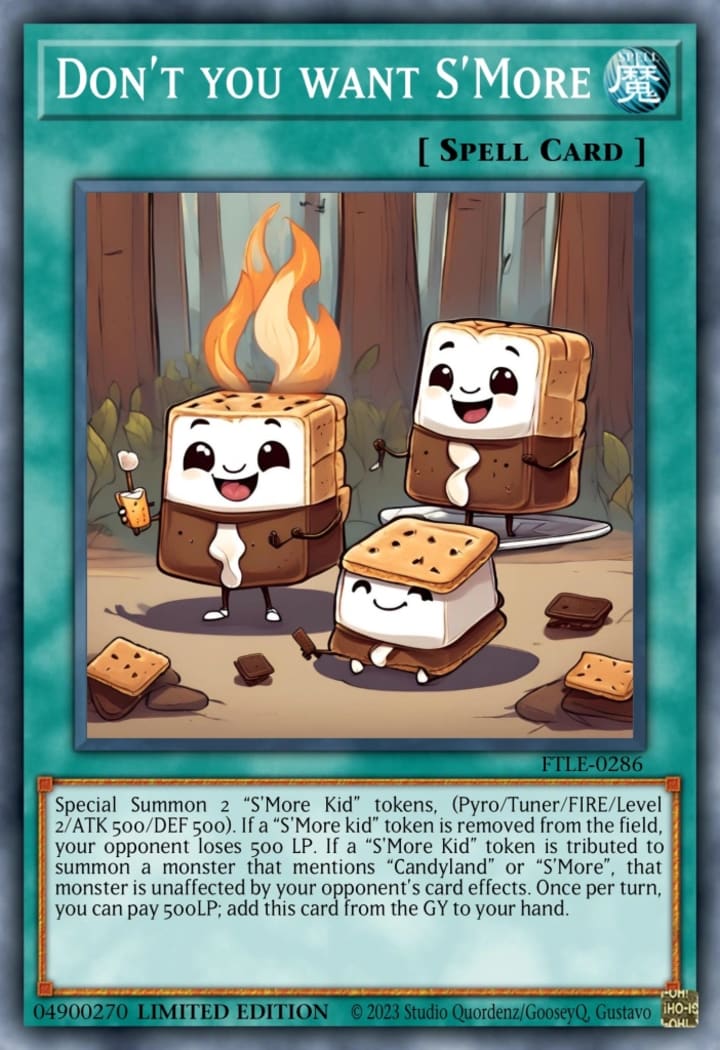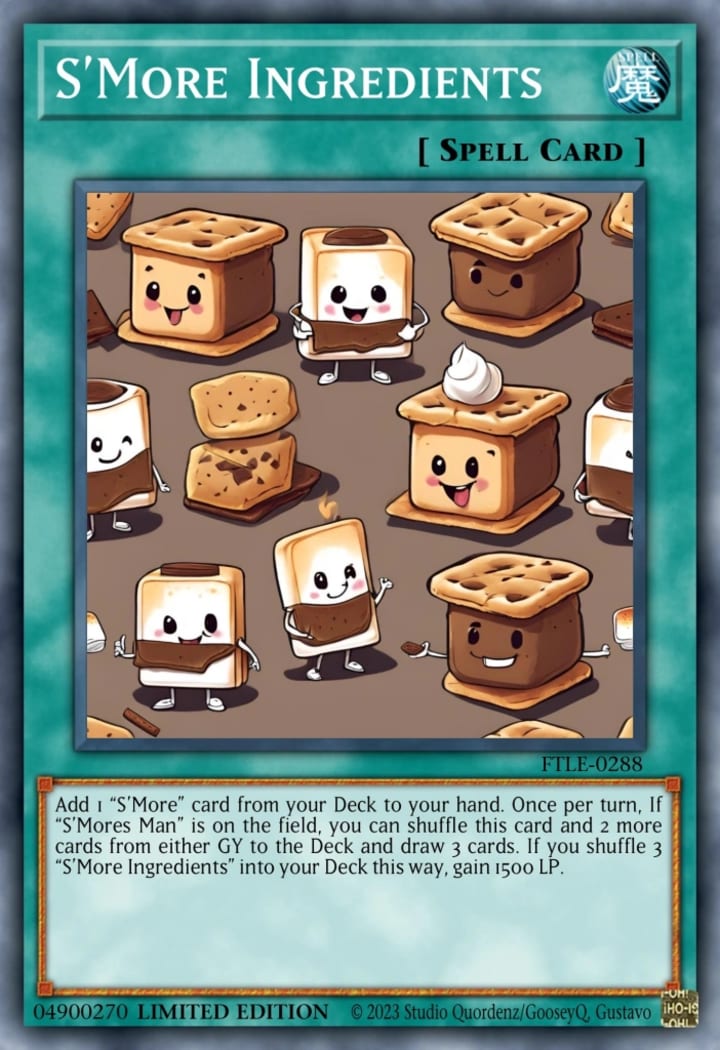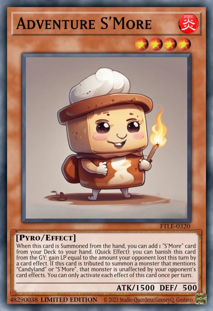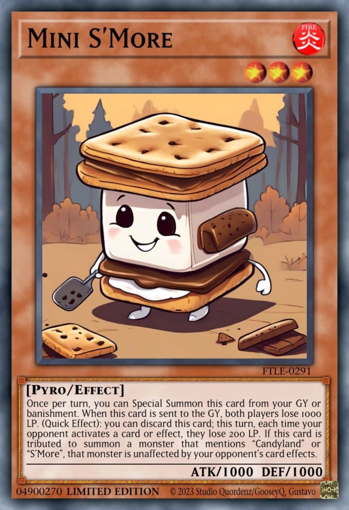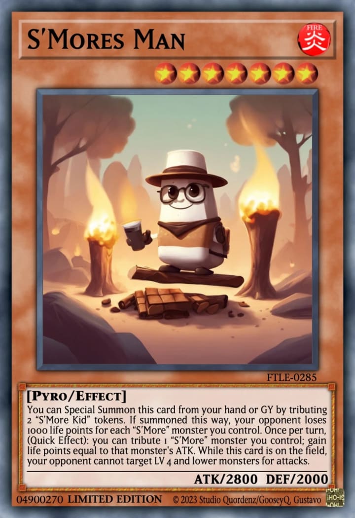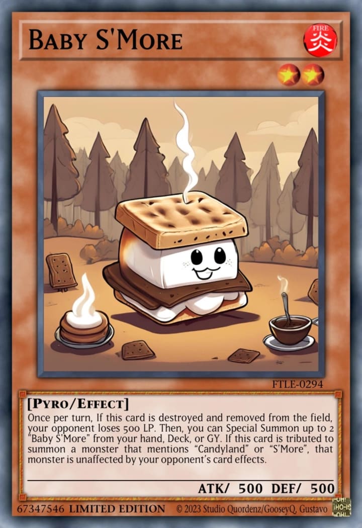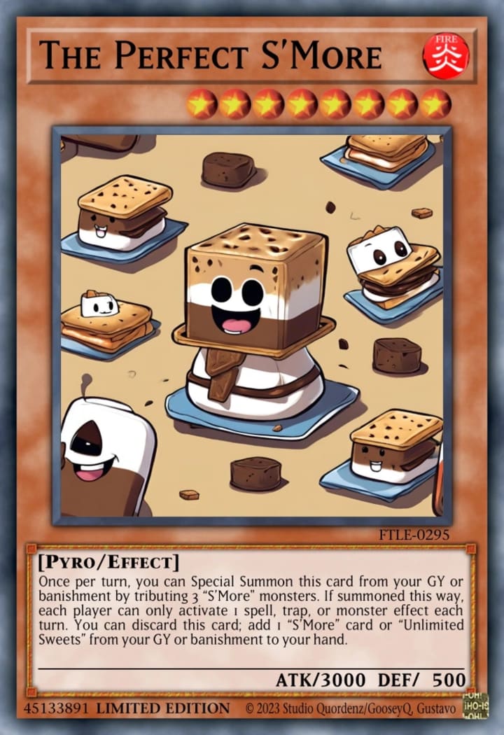 The stats for this card was heavily suggested and so it has been made to be the front runner of the deck. I went with the Fire attribute and Pyro typing because the idea of a s'more naturally being hot from melting over a fire and burning anyone who eats it too quickly connects more and provides the esthetic of inflicting damage to both players as well as potentially proving the player satisfaction as if to have eaten a s'more.