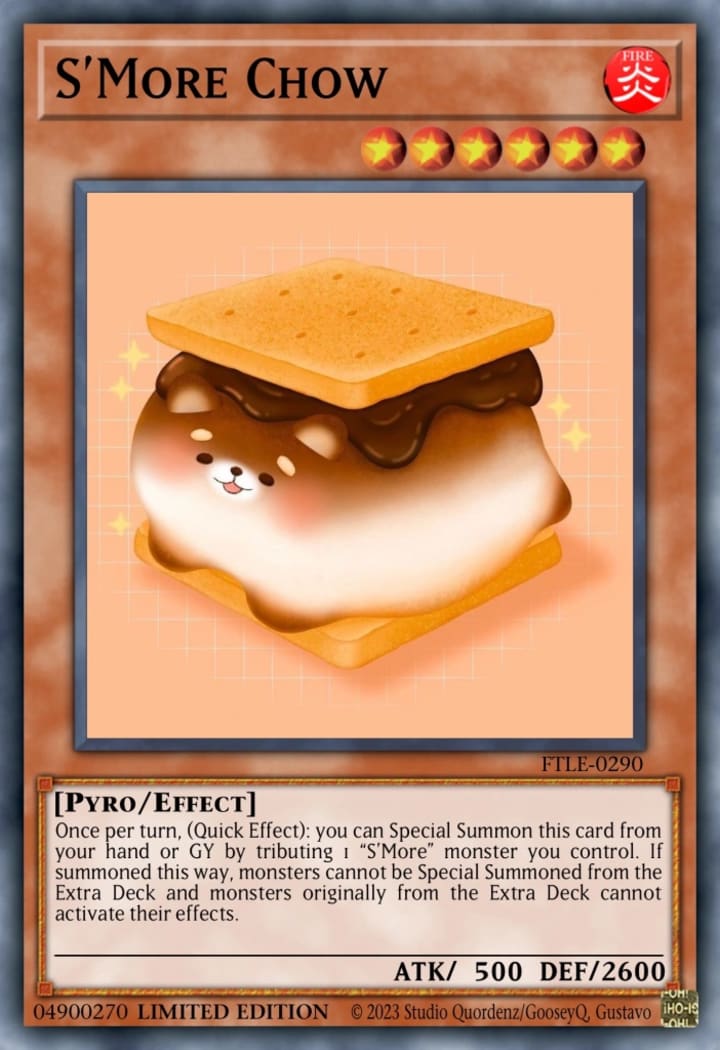 While most of these cards will be high attack or very versatile in their effects and ultimate strategy, this card is made to slow everyone down. S'More Chow is used to be a wall for the deck. A monster where you can have on the field and prevent players from using more resources while you continue your onslaught of inflicting damage to your opponent without attacking or being severely interrupted by your opponent.