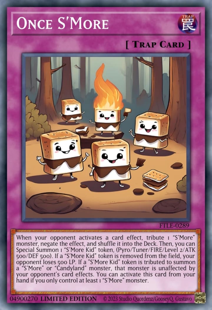 In case you are locked from spell cards, Once S'More is a card that blends infinite impermanence and summoning a trap monster together. This summons one token after negating your opponents monster effect. The focus is mainly on the cards working with themselves and their unique connection to s'mores.