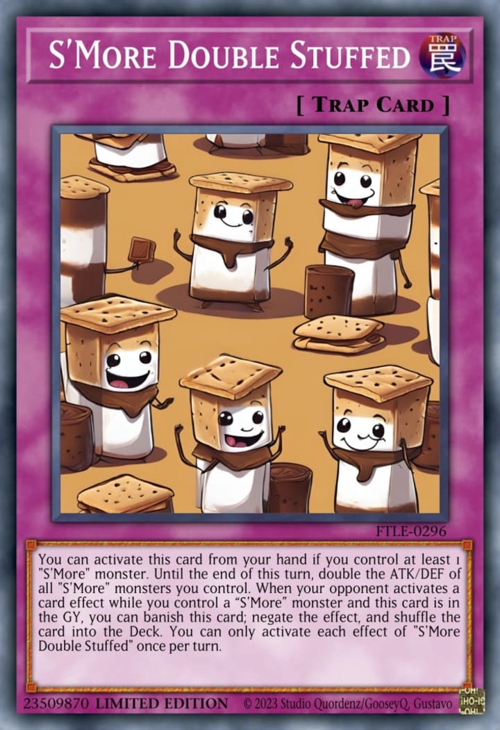 S'More Double Stuffed is our last trap card that allows you to double the offensive and defensive stats of your monsters. Like having extra marshmallows in your s'mores, this card is your defense against high attacking monsters as well as providing defense against your opponent by negating card effects while it's in the graveyard.