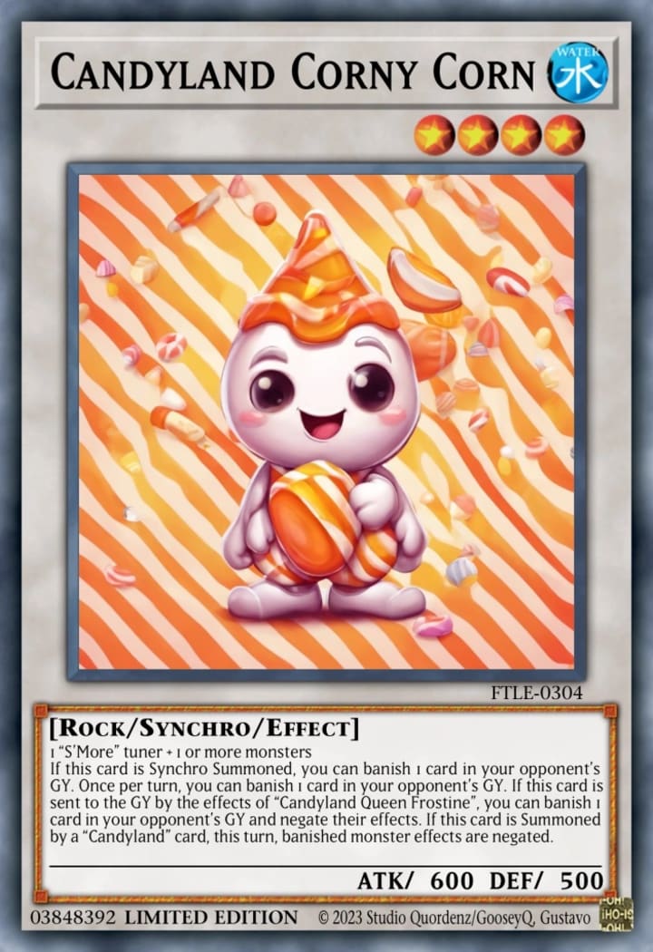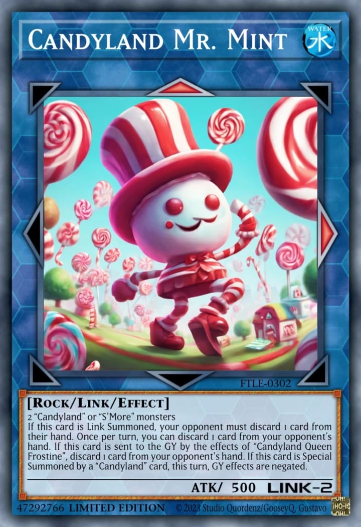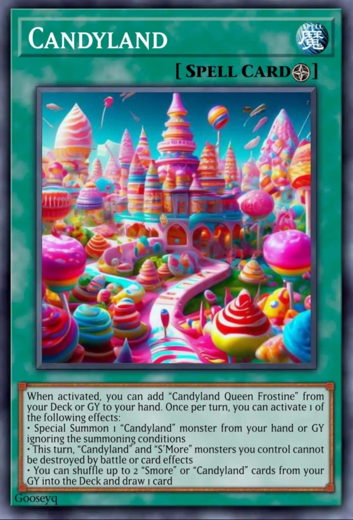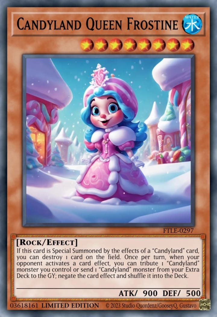 Candyland Queen Frostine is the main monster of the candyland series. She not only destroys cards upon summon but she negates your opponents attempt to stop you by simply sending candyland monsters to the graveyard. the goal is to summon this card when your S'more plays seems to fall short.