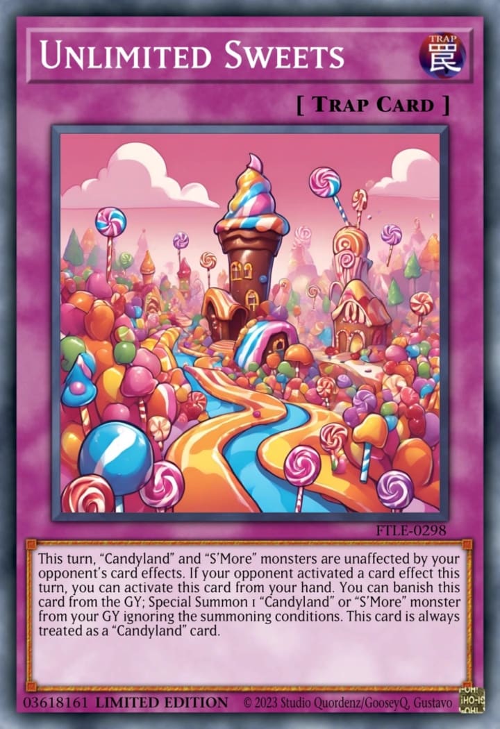 Unlimited Sweets is the trap alternate to candyland. This card acts as a call of the haunted while also providing temporary protection for all candyland monsters . Without modern staples like "Monster Reborn", this custom theme deck will need access to the graveyard and the monsters that inhabit it. Even though some monsters are able to summon themselves while in the graveyard, our monsters who live in the extra deck will need this added boost to be revived.
