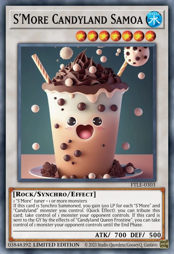 Now who doesn't want a hot cocoa? S'More Hot Cocoa is made to provide a boost for you as well as your monsters. From gaining life points to boosting your monsters attack, this card is a great hand trap for your S'More and Candyland monsters. The idea for this card comes from drinking actual cocoa. The nourishment from drinking something hot in a cold day as well as pairing a cocoa with your s'more to create a comforting meal.