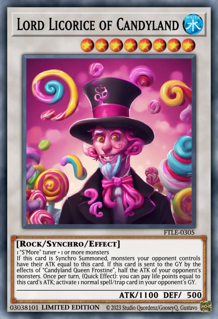 Lord Licorice of Candyland is known as the villain of the candyland series. An Antihero if you will who detours you down the path of chaos. For Licorice is a character from the candyland board game and is inspired by Willy Wonka and Tim Burton. He forces monsters to stoop to his level while also using sneaky tactics to use your opponent's resources to your advantage.
