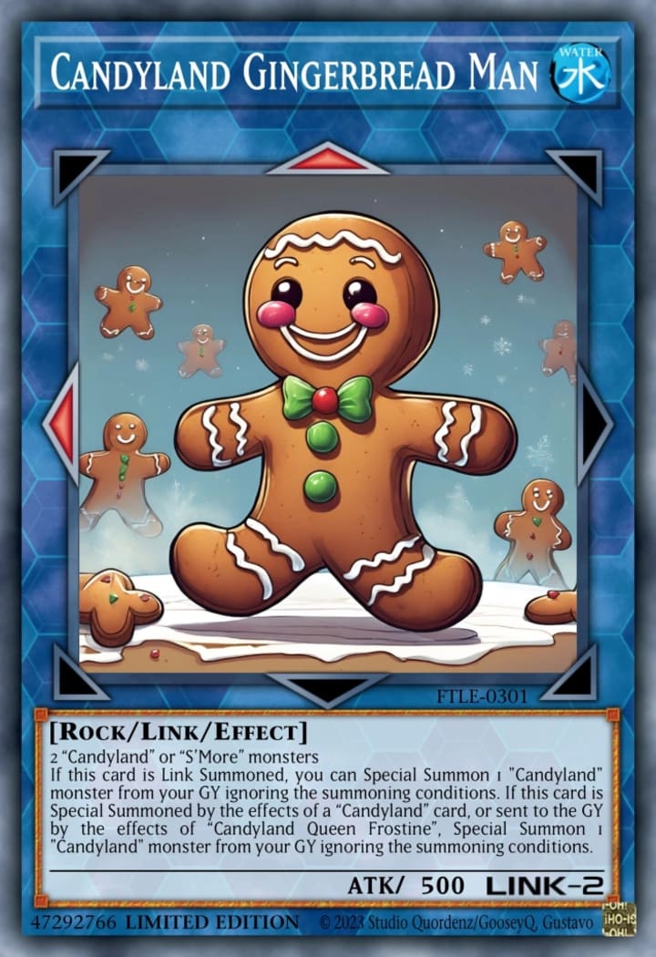 After our encounters with the synchro realm, we have link monsters, cards that are summoned from the extra deck simply by sending the specified monsters to the graveyard. All of these candyland monsters are to be summoned by sending any candyland or s'more monster together or separately to summon these sweet treats, Candyland Gingerbread Man is a card that grants you the power of Special Summoning any candyland monster from the graveyard and ignoring their summoning conditions which help when Frostine has sent them there.