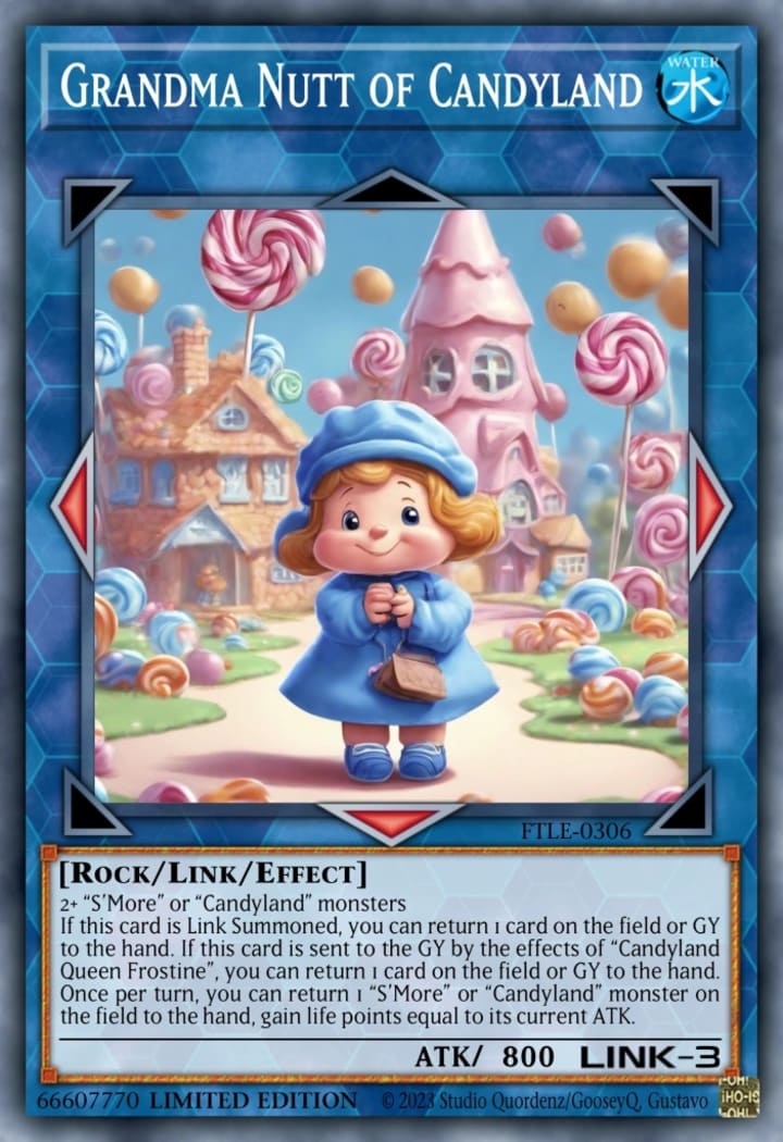 Our lovely Grandma Nutt of Candyland adds to our candyland family by gaining inspiration from the yugioh card "Firewall Dragon". By having the ability to return any card from the field or graveyard once per turn, or when it's summoned, gives you the chance to save some cards that may have been sent away or used as tribute for your strategies. This card is a link 3 instead of a link 2 to provide main coverage for other link monsters.