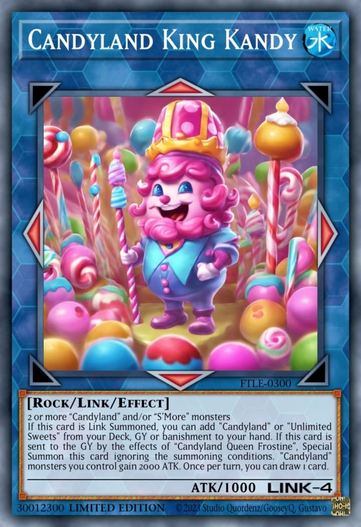 From our lovely S'More to the candies of our land we have finally approached the King of them all. Candyland King Kandy is our link 4 monster that not only summons itself once sent to the graveyard by the queen, by grants every candyland monster 2000 attack. While he doesn't give much protection, he provides such power for you to hit hard and to show the rest of the candyland kingdom who's the king.