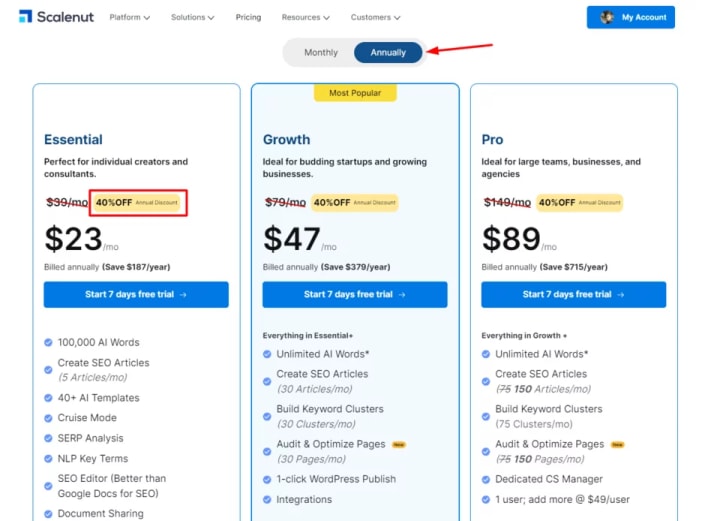 For those curious to try Scalenut, the platform offers a free trial. The trial provides a taste of its capabilities and allows users to gauge whether it aligns with their requirements before committing to a subscription.