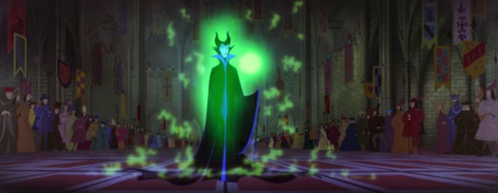 With a gust of wind, a bolt of lightning and cracking thunder Maleficent appears from green fire. Though she doesn’t seem annoyed at first, she claims to be quite ‘distressed’ of not being invited to the party. She says she is not offended, and then curses Aurora, she will prick her finger on a spinning wheel on her 16th birthday and die. A flash of light, and she disappears into a cloud of smoke laughing in quite an evil manner. It’s her appearance that makes her quite stunning. Horns, a black and purple cape, a staff, yellow eyes and a pet raven on her shoulder for an extra dramatic effect. It’s her green pale skin that stands out, Maleficent really is green with envy.