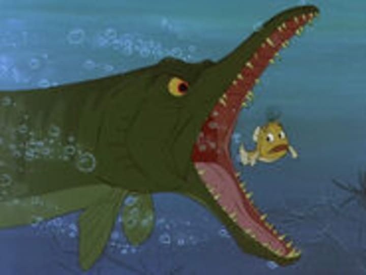 At one-point Arthur lurches out of the water with the pike following very closely behind. This catches the attention of Archimedes, Merlin’s owl who snaps into action quickly. He throws himself onto the pike and saves Arthur from death. Arthur makes it out and Merlin turns him back into a human. The pike in this scene certainly does look evil and menacing with his yellow red eye and sharp teeth.
