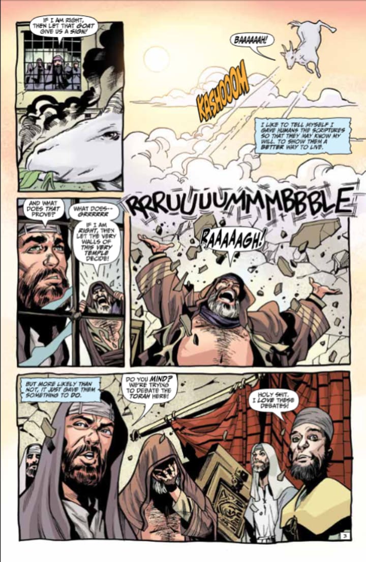 I am thoroughly enjoying the way that this is being told. The story & plot development that we see through how the sequence of events unfold as well as how the reader learns information is presented exceedingly well. The character development that we see through the narration, the dialogue, the character interaction as well as how we see them act and react to the situations and circumstances which they encounter. This keeps their ever changing, evolving personalities at the forefront. The pacing is excellent and as it takes us through the pages revealing more and more of the story makes us want to learn and see more. I mean the conversation between God and Jesus only makes me want to see more of that.