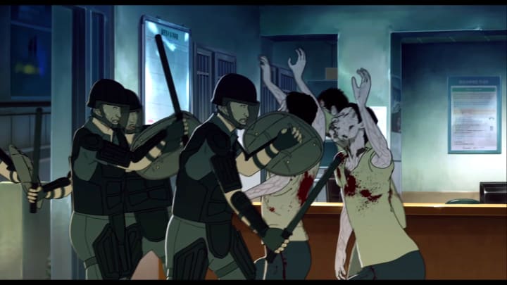 As if escaping from flesh-eating zombies isn't hard enough, they now have to face state soldiers fully armed with machine guns and water cannons, and stationed behind barricades that restrict the survivors within the Seoul Station vicinity — alongside the ravenous undead — so to contain the pandemic.