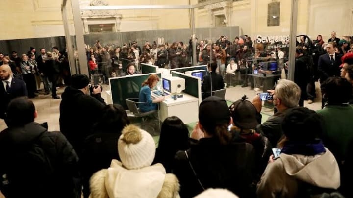 For a few hours, the usually bustling Grand Central Station was transformed into an extension of the Severance universe. A large glass box was set up in the station, containing a recreated cubicle from Lumon Industries, the mysterious company at the heart of the series. Inside, the actors pretended to work at their desks, mimicking the robotic behavior of their on-screen characters.