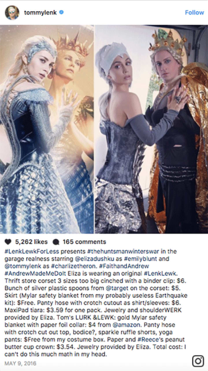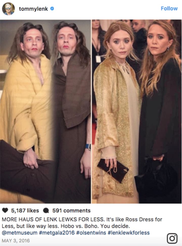 His project "Lenk Lewk For Less" asks you to ditch the pricey designer goods and go all D.I.Y. with household options. Can you can spot the celebrity and the Lenk?