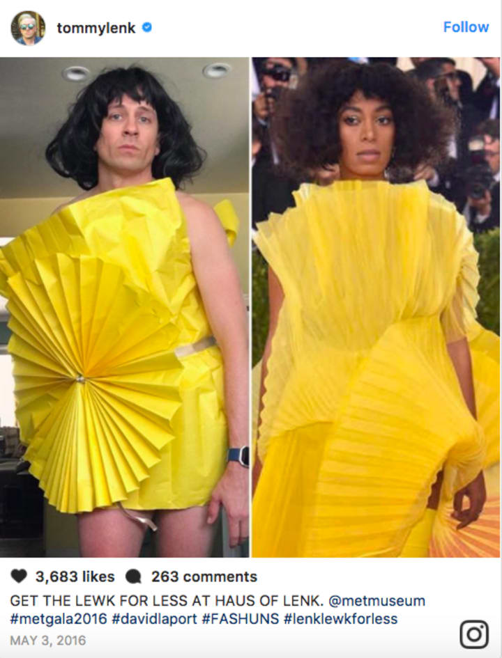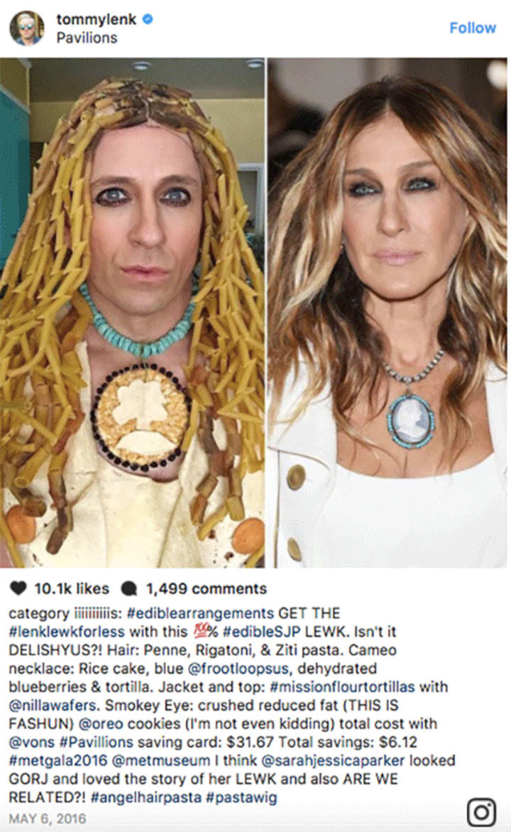 So whaddya think? We are committed to get the #LenkLewkForLess trending. The best part is you can do it too; forget those expensive Met Gala designers, Tom Lenk proves that some macaroni and a rice cake can make the perfect SJP.