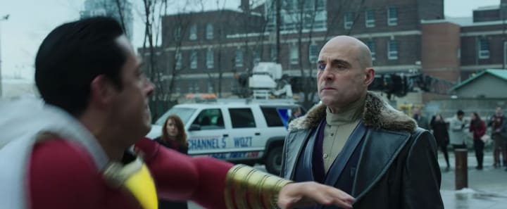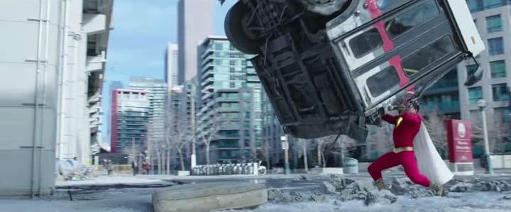 Besides this, there are just a few individual scenes that I have issues with. For example, there's a scene where Shazam catches a bus by its cracked windshield, and the windshield somehow doesn't completely break.