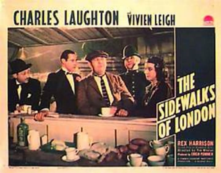 The 1938 British black and white comedy drama “Sidewalks of London” is also known as “St. Martin’s Lane.” It starred Vivien Leigh and Charles Laughton with co-stars Rex Harrison and Tyrone Guthrie.