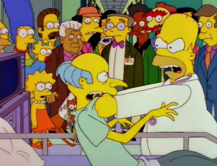 That wasn't the only thing that popped up. Burns woke up and shouted Homer's name. So now he remembers it. In fact, it's all he could say. Homer's taken in after the gun's found, but he ends up out of it. Lisa's convinced there's no way Homer could have done it, but Homeboy doesn't help his case when he suddenly appears in Burns' room and violently shakes him. The shaking actually brings Burns back to normal, and he asks Smithers who it is that is thrashing him. Homer grabs a gun and orders Burns to say that he didn't shoot him. Burns calmly says that there was no way Homer could have done it.