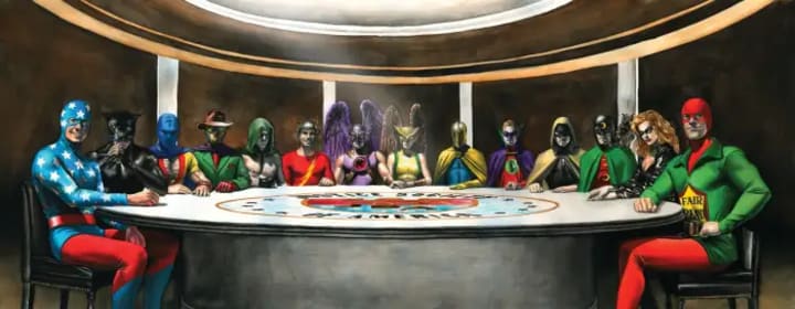 During this montage hints are given about their golden age origins. Ted Grant was a champion boxer and Jay Garrik was a research scientist. Some heroes had their backgrounds slightly changed. Scott Alan was made CEO of Broadcasting company rather than the founder of the golden age J.S.A. and Al Pratt was a physics professor at Calvin City College rather than being a student.