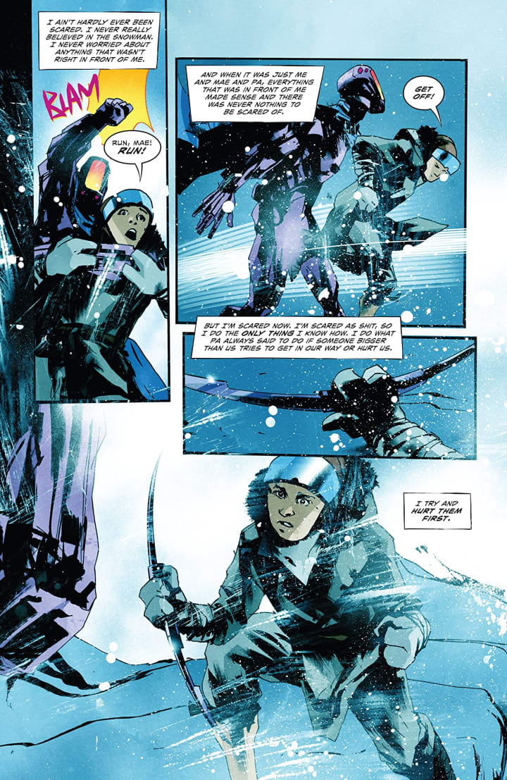 As the second arc barrels forward young Mae is running off with the device that the dude in the suit wants while Milli buys her time. This issue has a lot more storytelling to it than we’ve seen in the past and it is kind of exciting to me. Previously we’ve gotten along nicely with limited words and a lot of brilliant imagery and here the two meld more evenly and it feels like something huge is awaiting on the horizon. Whether that’s the completion of the story itself or just for now something big is waiting for us next issue and if this issue's ending is any indication well I cannot wait.
